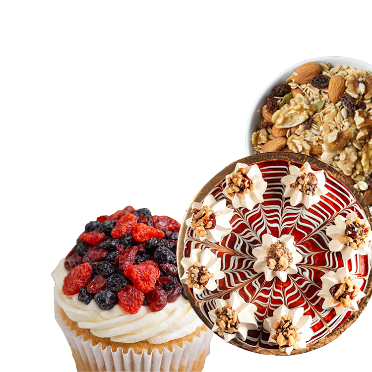 Campuran buah kering dan kacang-kacangan sebagai topping kue, dessert dan snack sehat, menghadirkan perpaduan rasa manis dan gurih yang memperkaya cita rasa sekaligus mempercantik tampilan hidangan.